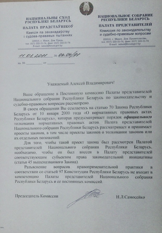 Обращение в Палату представителей Национального собрания Республики Беларусь дало неожиданный результат. Палата представителей даёт толкование одних зконоа путём принятия других. А внести предложение о принятии нового закона о толковании старого закона своим обращением граждане совершенно никак не могут.